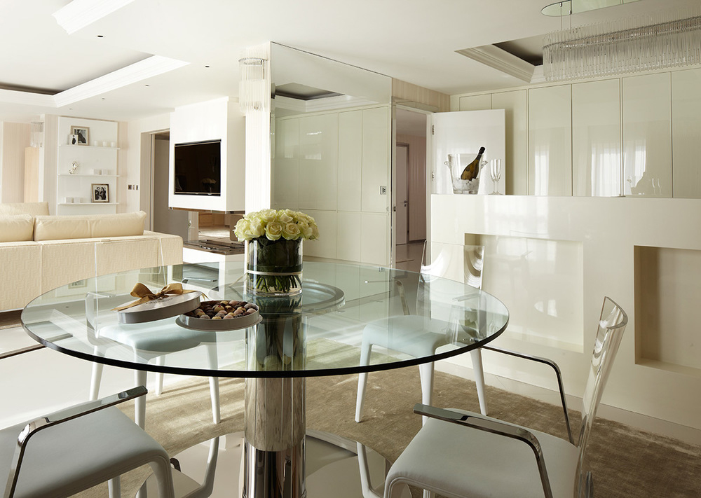 The white shiny textured ceramic floor tiles in the entrance area were laid in diamond design to help visually widen the space. Anna Grace-Davidson created an open plan living, kitchen, dining and study space set across floor to ceiling windows that spanned the length of the apartment, making a feature of the stunning London views.